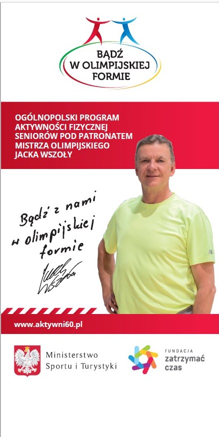 Zapraszamy do udziału w programie „Bądź w olimpijskiej formie”. Projekt to wieloletnie przedsięwzięcie, którego celem jest propagowanie aktywności fizycznej wśród grupy wiekowej 60+. Głównym ambasadorem programu jest wybitny polski sportowiec, mistrz olimpijski Władysław Kozakiewicz. Projekt realizowany jest w ramach „Rządowego Programu na rzecz Aktywności Społecznej Osób Starszych na lata 2012-2013” oraz „Rządowego Programu na rzecz Aktywności Społecznej Osób Starszych na lata 2014-2020” Ministerstwa Pracy i Polityki Społecznej.